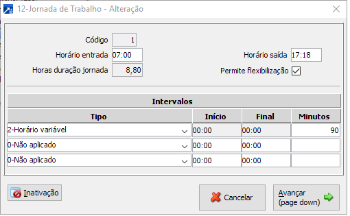 Quando desmarcada esta flag, significa que o horário não é rígido e será preciso informar os horários de entra, saída e de intervalos. Quando marcada a flag significa que o horário é flexível, neste caso, informar a entrada e saída da jornada e nos campos de intervalo informar apenas a quantidade em minutos do mesmo, veja modelo abaixo.