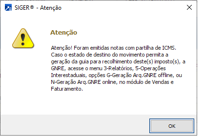 No final da emissão de notas que se enquadrem em alguma dessas situações, o SIGER® exibe a seguinte mensagem: