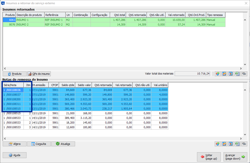 Vincula o saldo da nota de beneficiamento ao insumo retornado.