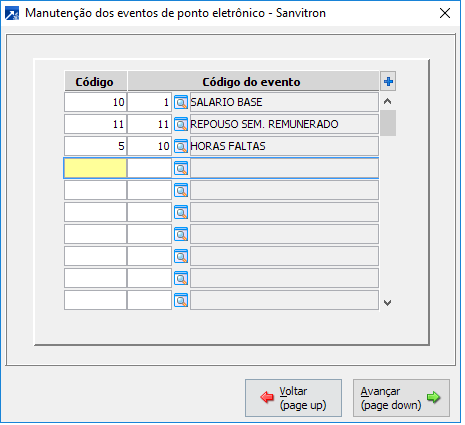 Preencher a tabela de DE PARA MENU 2.6-C referente aos eventos que serão importados do ponto para folha. Nesta tabela a primeira coluna é o código do evento do ponto e na segunda coluna o código do evento do SIGER®.