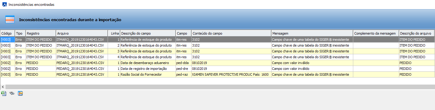 Ao clicar em <SIM> o sistema abrirá uma tela com os erros processados.