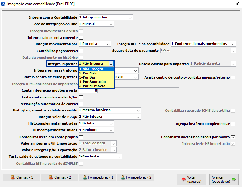 Na empresa dos Livros Fiscais, menu 1.2-A, botão <Dados das integrações>, botão <Integração com a contabilidade>, deverá estar com o campo "Integra impostos" diferente de "1-Não integra".