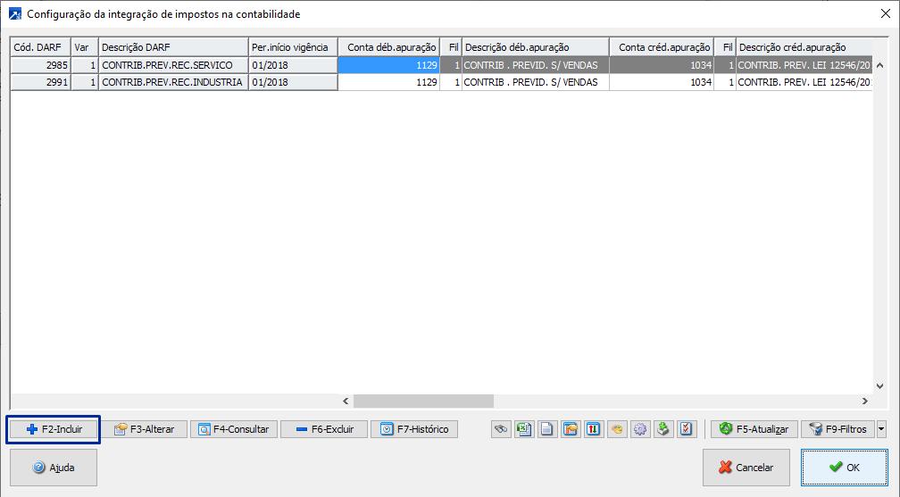 No menu LFI 2.9-B, configurar as contas para integração. Ao acessar a opção abre a janela da manutenção consolidada da configuração, clique no botão <Incluir> ou tecle F2: