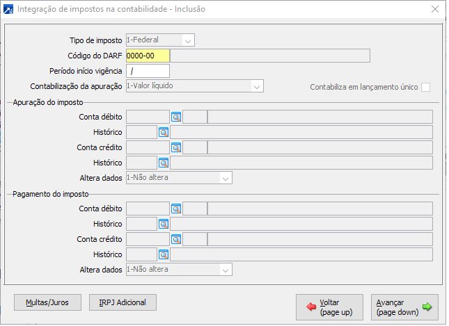 No campo "Código do DARF" informar o código do recolhimento do imposto a contabilizar e em seguida informe o período de vigência da configuração. Esta configuração estará vigente para as apurações e pagamentos de impostos até que a próxima tabela de configuração seja incluída com data superior a tabela vigente. Não é necessário incluir todos os meses, somente se desejar mudar alguma configuração da tabela.