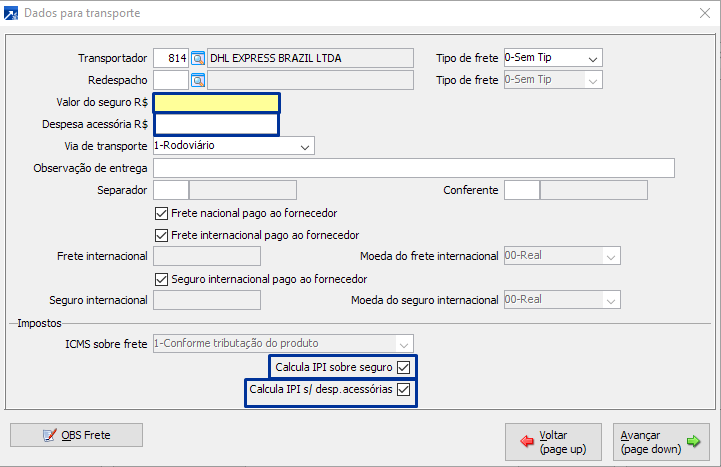 Na janela "Dados para transporte", existem os campos para informar valores de Frete, Seguro e Despesas Acessórias, todos estes serão somados no Total da NF e demonstrados em seus campos próprios no DANFE.