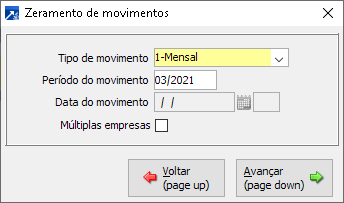 utilizado para excluir os movimentos mensais diários e complementares de um período, para um ou vários funcionários, podendo zerar o o movimento de um ou vários eventos. Menu utilizado para zerar os movimentos importados do ponto.