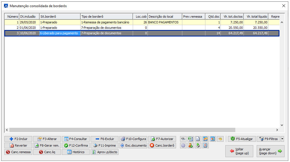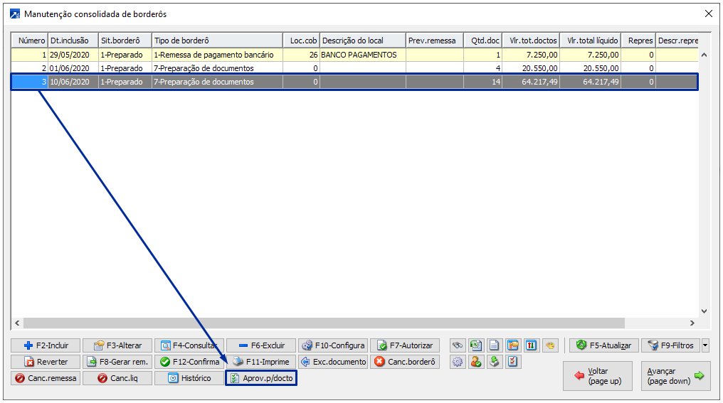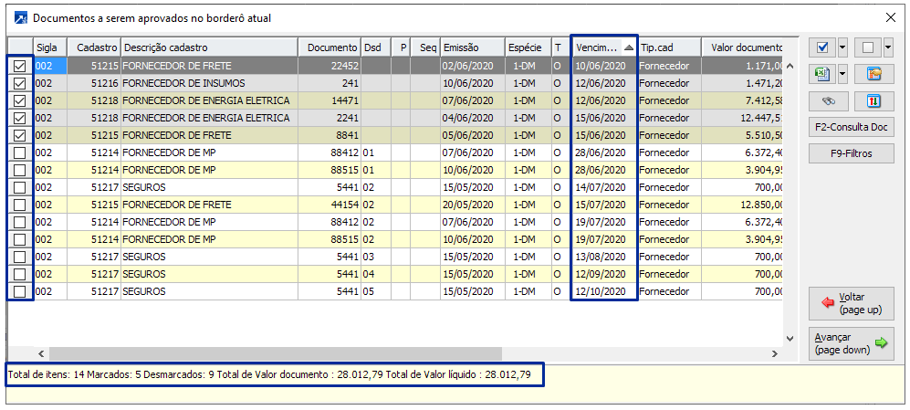 Dica: Ordene os Documentos pela data de vencimento clicando duas vezes no campo "Vencimento", dessa forma os Documentos serão ordenados por data de vencimento, facilitando a aprovação.