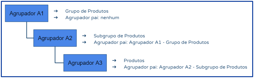 Exemplo 1: Caso seja necessário criar metas com três níveis, como por exemplo, grupo de produtos, subgrupo de produtos e produtos, pode-se criar 3 agrupadores. O primeiro será referente ao grupo de produtos e não terá agrupador pai. O segundo agrupador será relativo ao subgrupo de produtos e, para manter a hierarquia, deve ser informado como agrupador pai o agrupador do grupo de produtos. Por fim, o último agrupador será o de produtos, o qual terá como agrupador pai o agrupador de subgrupo de produtos.