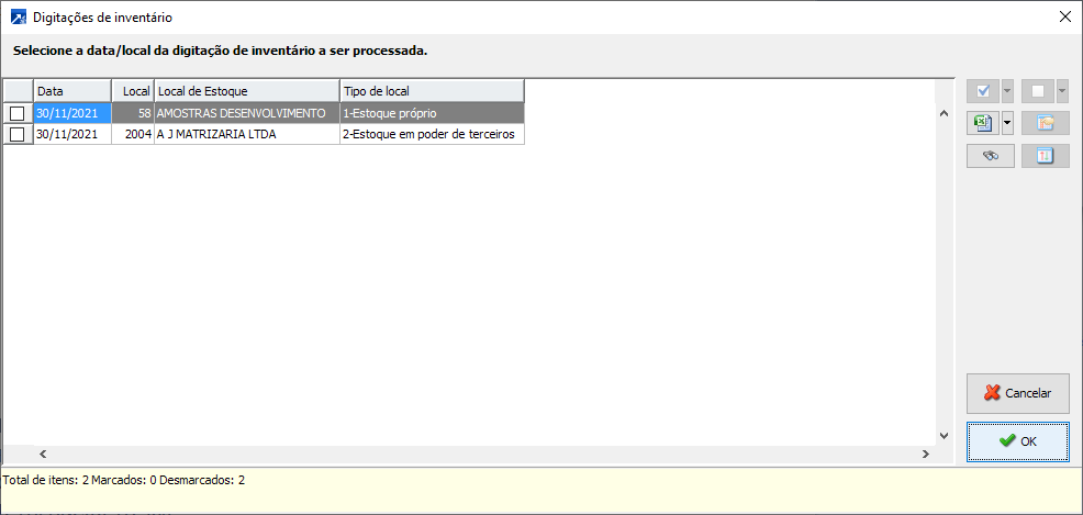 Na próxima tela será exibida a seleção padrão das digitações de inventário. Nesta tela é possível executar dentre outros: filtro por local de estoque (ajustar digitações somente de um local), filtro por código de produto (ajustar digitações somente de determinados códigos de produtos ou somente de determinados grupos de produtos), etc.