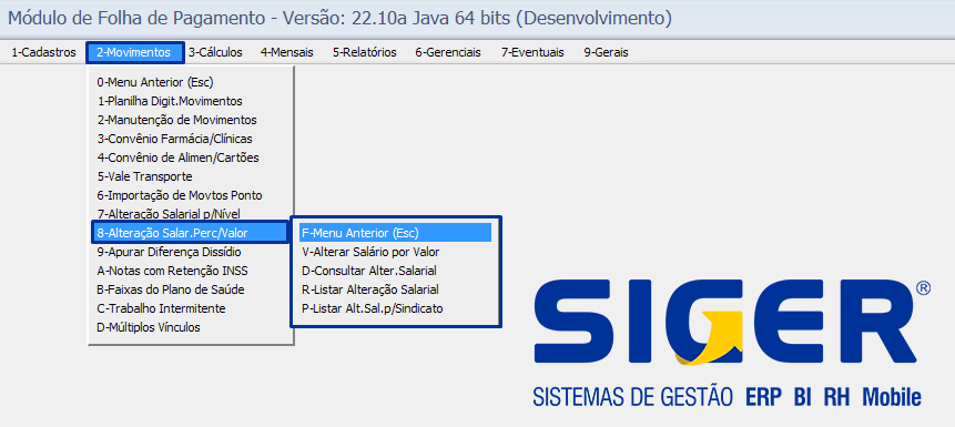 utilizado para fazer as alterações salariais, por valor MENU 2.8-V, pelo sindicato MENU 2.8-P e alteração por empresa MENU 2.8-R.