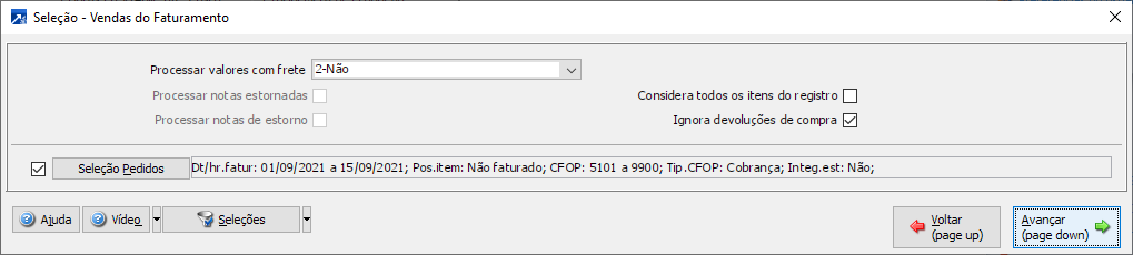 A segunda seleção padrão é a seleção de Vendas do faturamento, que permite filtros relacionados aos Pedidos do Faturamento.