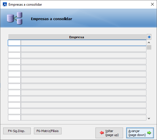 Na próxima tela é possível indicar a consolidação de empresas, caso seja necessário listar dados de mais de uma sigla em uma mesma tela.