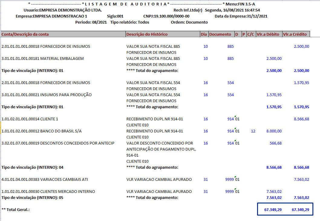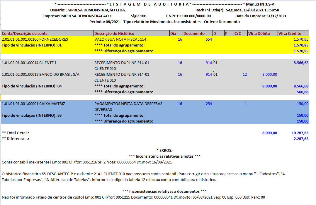Exemplo do relatório depois de corrigidas as inconsistências, sem diferença/inconsistência nos valores a débito e a crédito, neste exemplo foi listado com todos os movimentos, pois não há mais inconsistências.