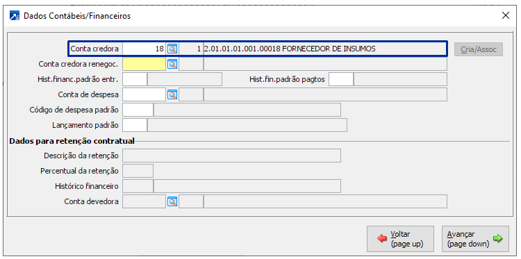 Solução 1: Acessar a alteração do cadastro no menu FIN 1.5-A, informar a conta contábil no botão <Financeiros> e <Dad.Contábeis/Fin.>, como se trata de um fornecedor, informar a conta no campo "Conta credora", caso utilize a conta aberta no plano de contas contábil.