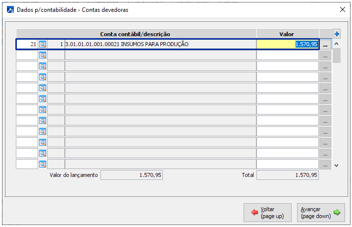 Solução 2: Acessar alteração da nota fiscal no menu FIN 2.1-A, informar os dados da nota e avançar até a janela "Dados´p/contabilidade" e informar a conta contábil de contrapartida do lançamento, neste exemplo, será conta devedora por se tratar de uma nota fiscal de fornecedor.