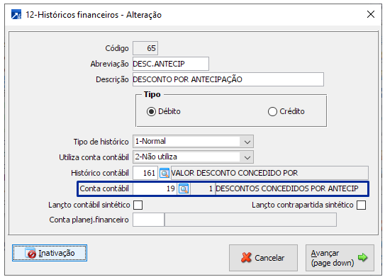 Inconsistência: O histórico financeiro 65-DESC.ANTECIP e o cliente 2141-CLIENTE 010 não possuem conta contábil! Para corrigir esta situação, acesse o menu "1-Cadastros", "4-Tabelas por Empresas", "A-Alteração de Tabelas", informe o código da tabela 12 e inclua conta contábil para o histórico.