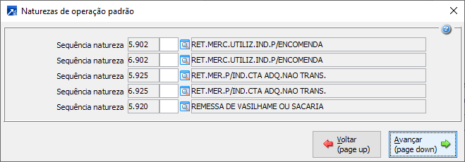 Acessa a janela de naturezas de operação padrão.