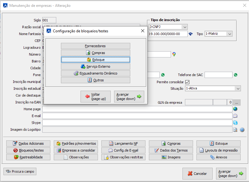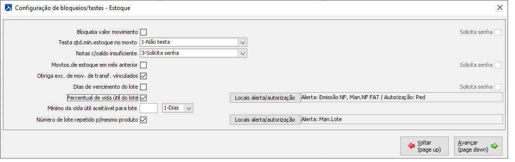 Botão <Estoque> marcar o flag: "Percentual de vida útil do lote" (bloqueia o uso do lote com vida útil abaixo do definido para o cliente/fornecedor) e/ou "Mínimo da vida útil aceitável para lote" (dias/percentual mínimo exigido para o lote nos pedidos, padrão para todos os produtos).