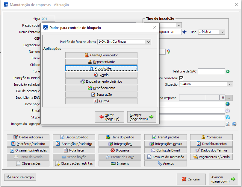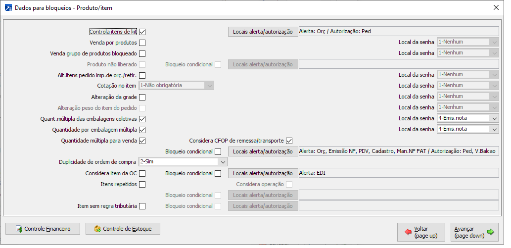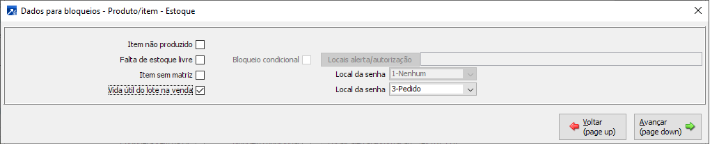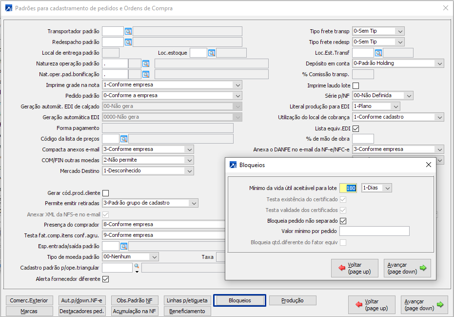 Botão <Bloqueios> no campo "Mínimo da vida útil aceitável para o lote" definir a quantidade de dias para aceitar o lote nos pedidos:
