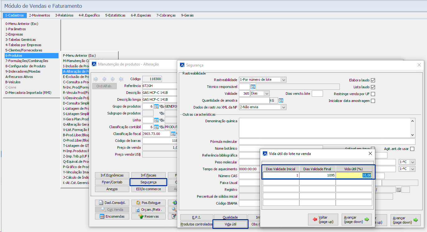 No menu FAT 1.6-A Cadastro de produtos, botão <Segurança>, botão <Vida útil> definir uma faixa de dias e um percentual de vida útil para o lote do produto: