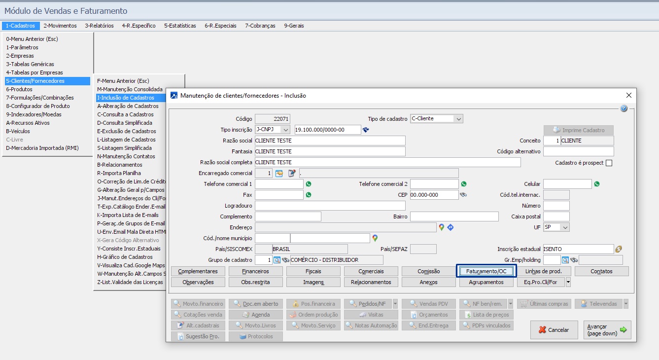 No FAT 1.5-A Cadastro de clientes, botão <Faturamento/OC>