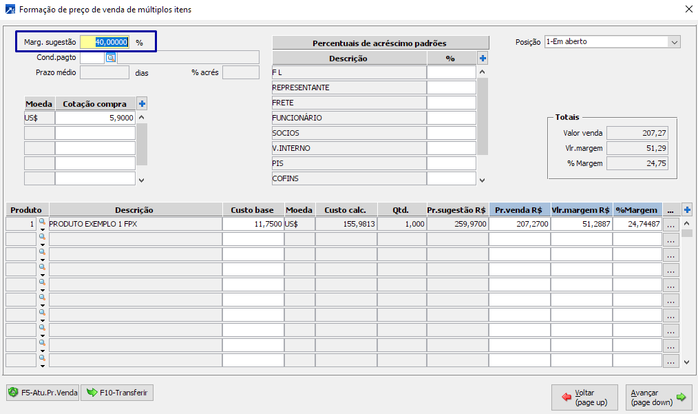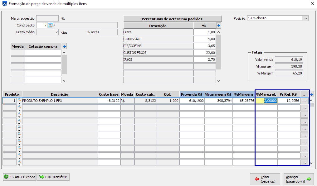Neste cenário, cada produto terá uma margem de referência para cáculo.