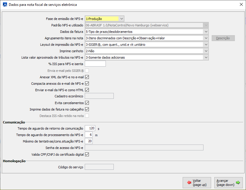 As configurações para emissão da NFS-e (nota fiscal de serviço eletrônica) está disponível no menu AUE 1.2-A, botões <Dados adicionais> e <Dados para NFS-e>.