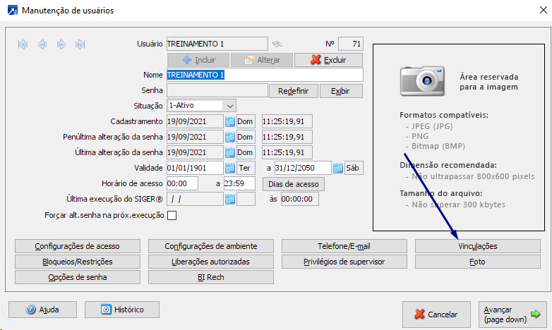 Uma vez dentro do cadastro de usuários, clique no botão <Vinculações>