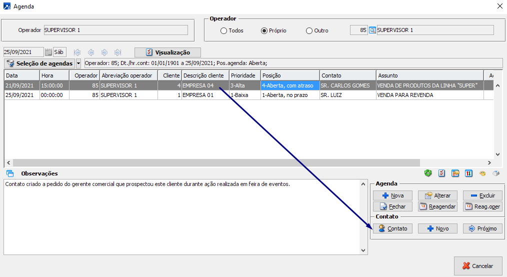 Ou seja: é possível efetuar novos agendamentos por dentro de um contato.