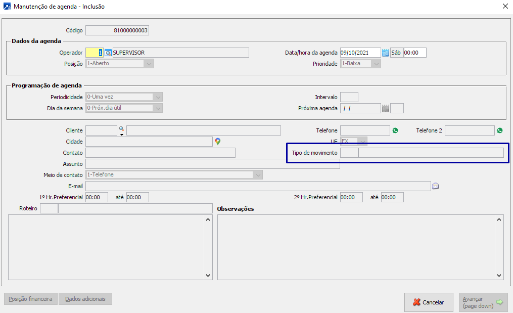 Se o contato está sendo realizado a partir de um agendamento criado no SIGER® o tipo de contato virá da agenda. Vide:
