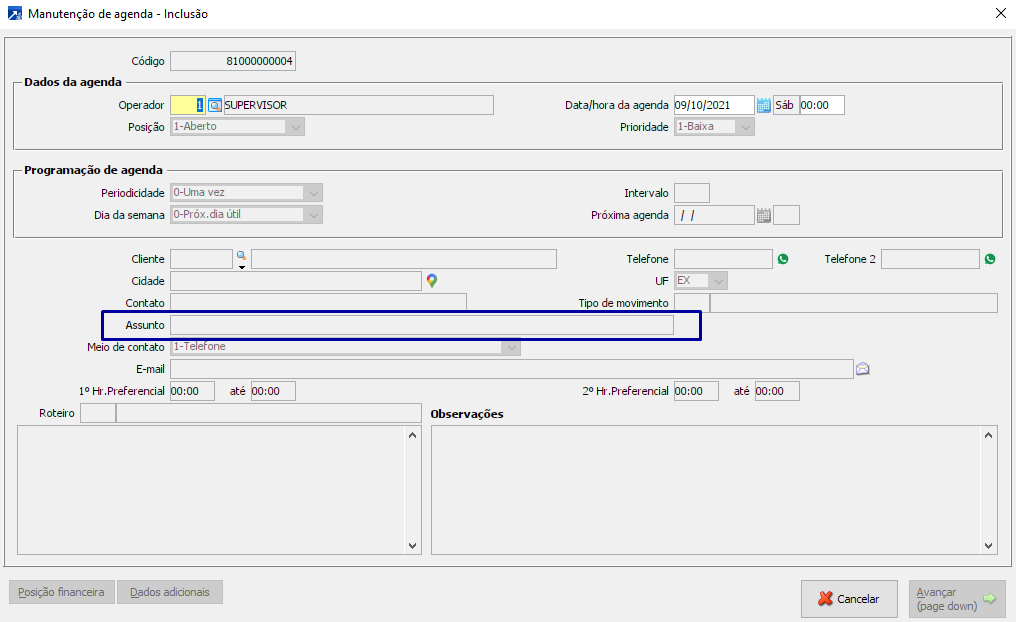 Mas atenção: Não cadastrar o cliente a qual se está realizando o contato, apesar de ser possível, nem sempre é o procedimento mais indicado. Pois dificulta, mais, tarde o rastreamento do "histórico" de contatos junto a essa organização já que o registro não fica vinculado a um cadastro válido.