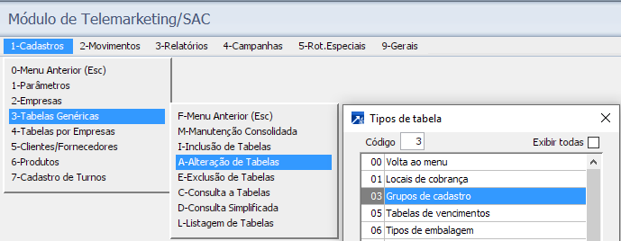 >Empresa possui um grupo de cadastros (Tabela "genérica 03") chamado "Varejo".