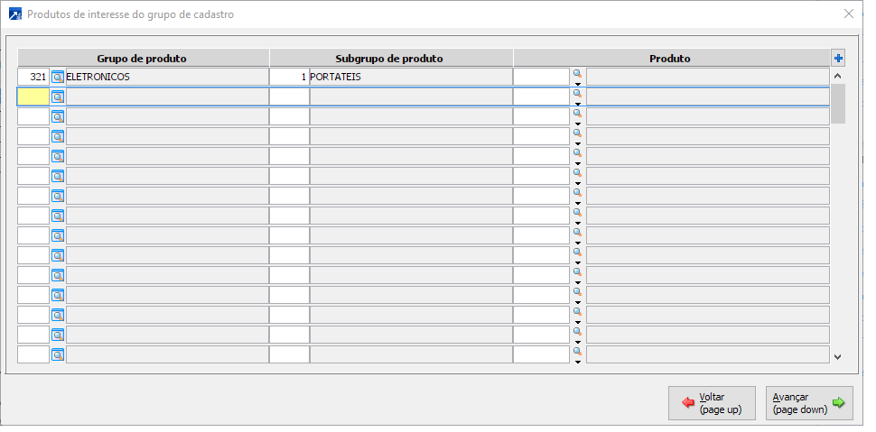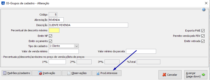 Na tela do cadastro de grupos, clicar em <Prod.interesse>
