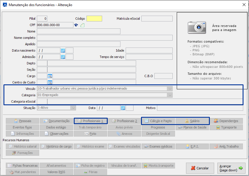 O cadastro do funcionário aprendiz MENU 18-I, tem a particularidade, de ser vinculo 55 categoria 7, categoria eSocial 103, dias de contrato informado no botão <Profissionais 1> horas semanais no máximo 22 horas, e deve ser informado no botão <Cálculo e Pagto> e o tipo de salário mensalista ou horista e o valor do salário botão <Salário>.