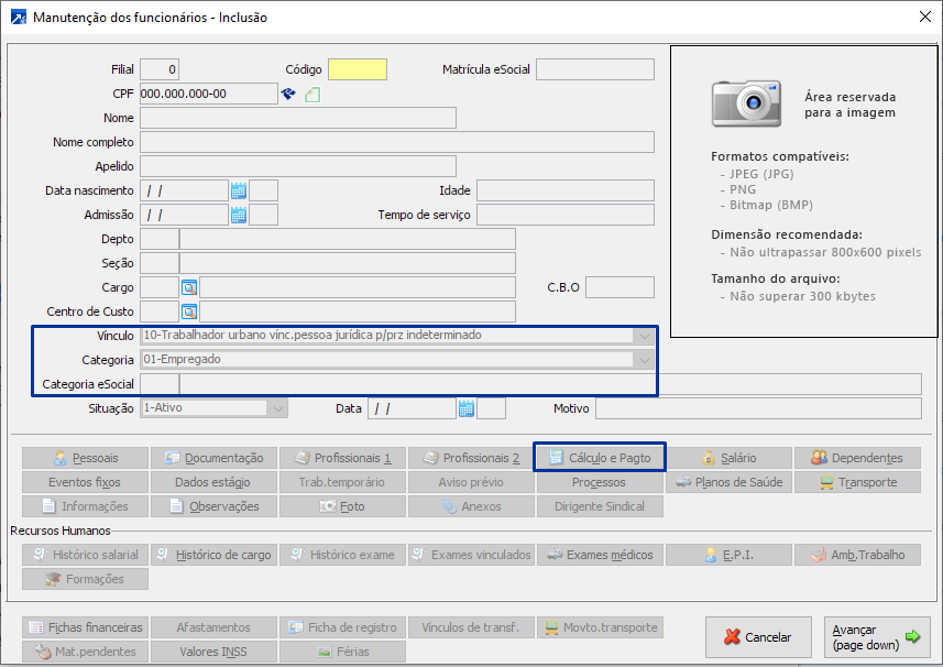 O cadastro do funcionário MEI é obrigatório quando a empresa precisa fazer o recolhimento do INSS PATRONAL sobre o serviço prestado. Desta forma o cadastro do funcionário MEI (Microempreedor Individual) é no MENU 1.8-I, e tem a particularidade, do vinculo 99, categoria 13, categoria eSocial 741, no botão <Cálculo e Pagto> desmarcar a flag RECOLHE INSS.