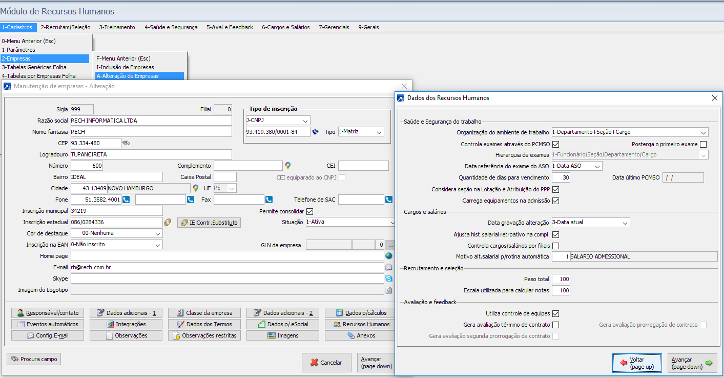 São necessárias algumas configurações no cadastro da Empresa para a utilização de cada módulo de RHU contratado, estas definições o técnico de implantação da Rech vai checar com o cliente e colocar as informadas nos campos que ficam no menu 1.2-A no botão < Recursos Humanos>, conforme a  imagem abaixo.