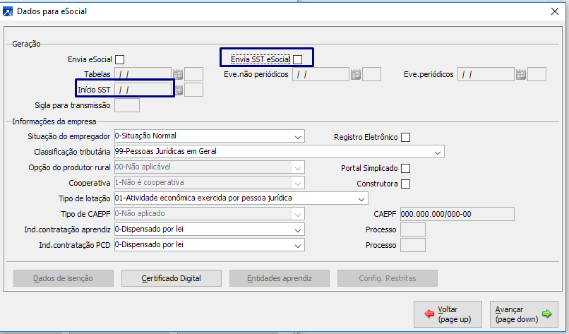 Outra configuração importante, também no cadastro da Empresa, em 1.2-A no botão < dados p/eSocial >, necessárias à Saúde e Segurança do Trabalho para os envios de tarefas de SST ao eSocial estão assinaladas na imagem abaixo.