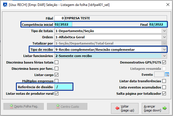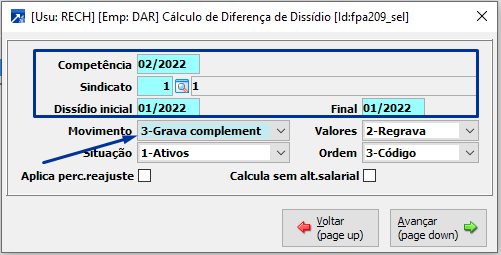 Informar o período que será calculado a folha complementar, precisa ser o mesmo período que foi gravado as diferenças de dissídio.