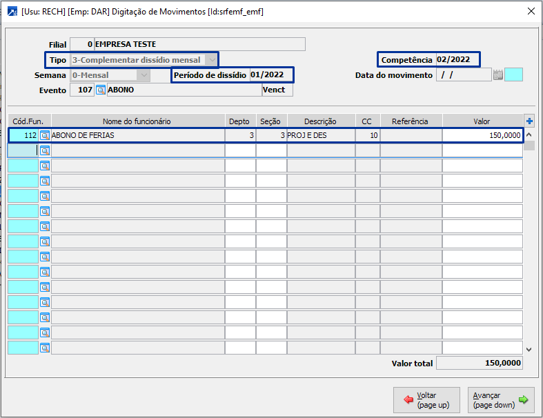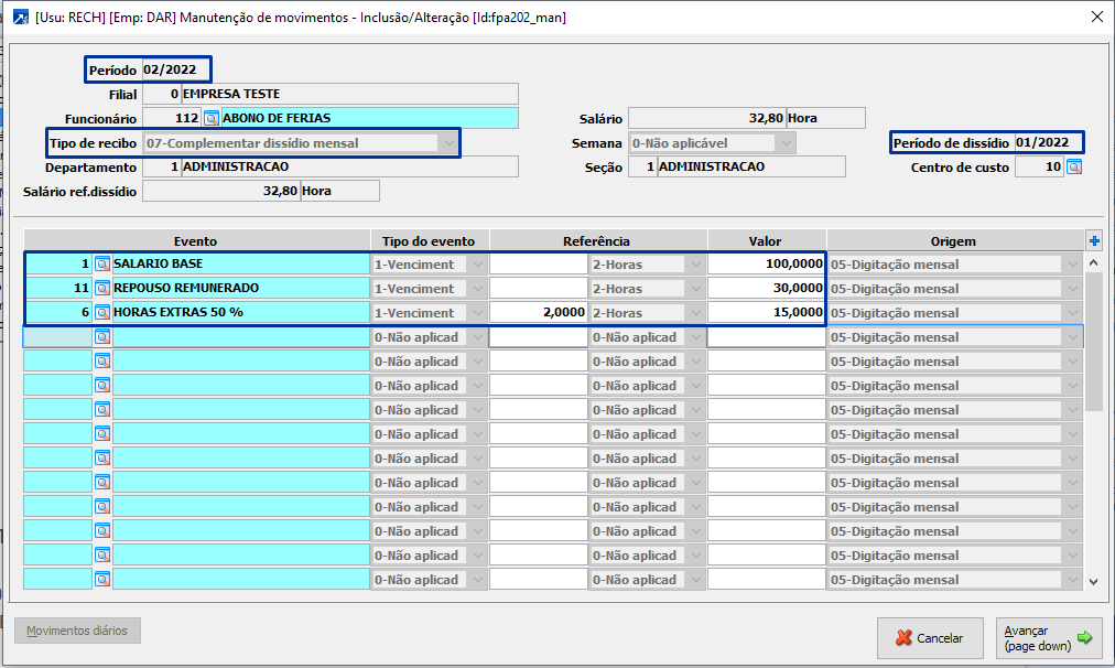 - O MENU 2.2-T pode ser utilizando para incluir um evento especifico com valores diferentes para múltiplos funcionários na folha complementar, para depois ser calculado no MENU 3.2-R, onde será apurado o INSS e IRRF.