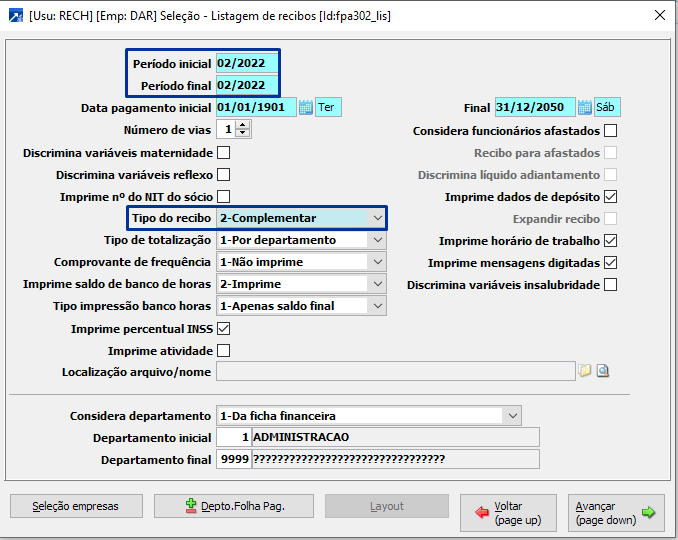 Para listar os recibos da folha complementar MENU 3.2-L, na segunda tela, informar o período do calculo e no campo "Tipo de recibo" selecionar opção "2-Complementar".