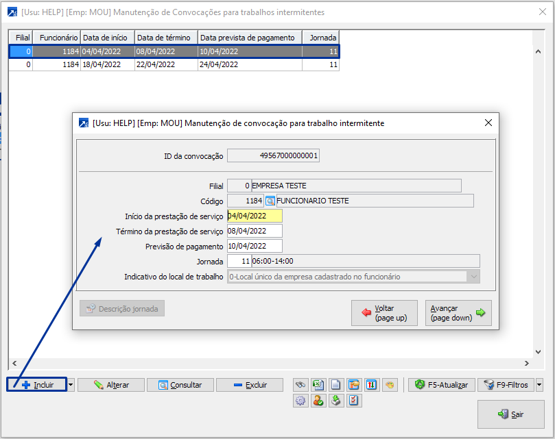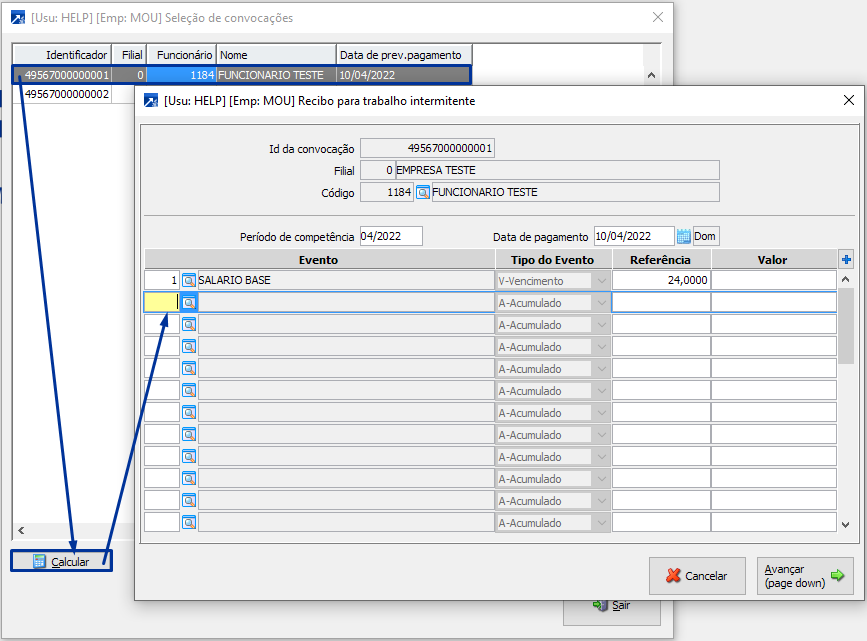 IMPORTANTE: Antes de calcular o recibo mensal do intermitente é necessário incluir as convocações, MENU 2.C-M. O cadastro do funcionário com contrato intermitente, precisa ter o vínculo 10, categoria 1, categoria eSocial 111, salário por hora, jornada de trabalho com tipo para eSocial opção "Outros tipos" e no botão <Profissionais 2> marcar a flag "Trabalho intermitente", para consultar o cadastro do funcionário MENU 1.8-D ou MENU 1.8-C.