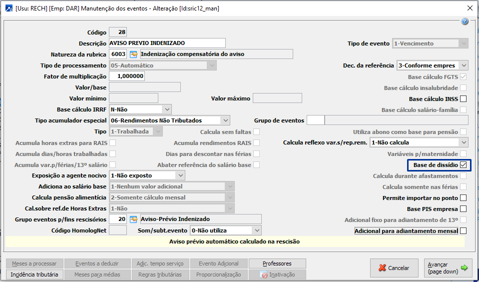 Obs.: antes de calcular a rescisão complementar, precisa verificar e configurar os eventos utilizados na folha mensal e na rescisão original para marcar a flag "base de dissídio" no MENU 1.7-A. Exemplo o evento 28-Aviso prévio indenizado.