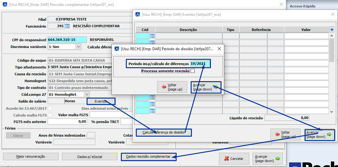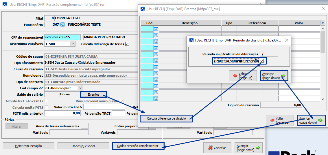Exemplo 2: apurar as diferenças de dissídio/acordo para ser pago em folha complementar após a rescisão contratual e depois calcular a rescisão complementar com as diferenças somente da rescisão original.