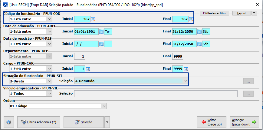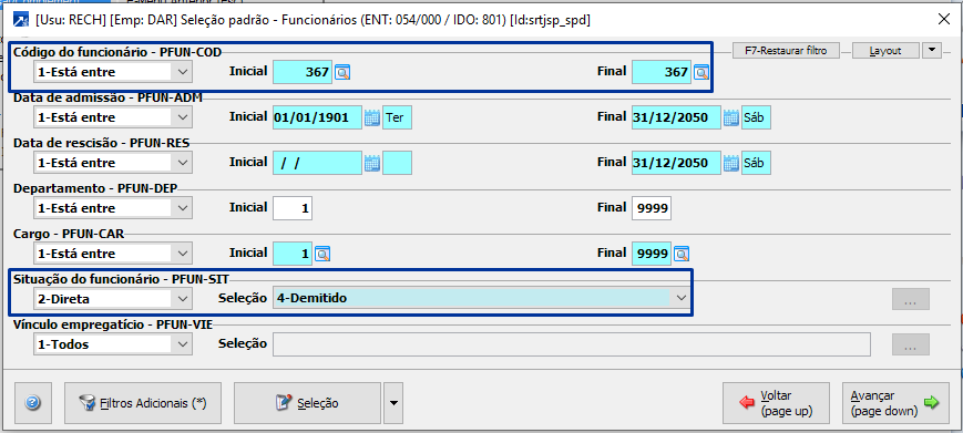 Para calcular a folha complementar funcionário demitido MENU 3.2-R, informar os dados da complementar e na segunda tela, informar o código do funcionário e no campo "Situação do funcionário" selecionar "Demitido".
