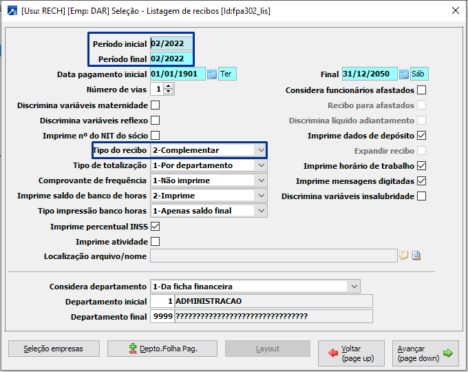 Para listar os recibos complementares MENU 3.2-L, informa o código do funcionário, e no campo "Situação do funcionário" selecione a opção "Demitido", na segunda tela, informa a competência que foi calculado a folha complementar e no campo "Recibo" selecione a opção "Complementar".