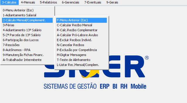 MENU 3.2-C calcula folha mensal, MENU 3.2-R calcula folha complementar, MENU 3.2-A calcula pro labore avulso, MENU 3.2-E excluir recibos individual, MENU 3.2-P exclui recibo por competência, MENU 3.2-L lista os recibos por funcionário e por competência, MENU 3.2-M permite incluir mensagens na impressão dos recibos.