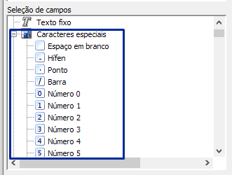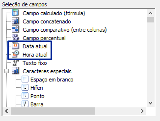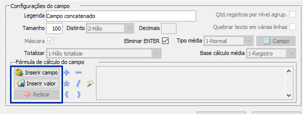 A manutenção dele é feita nas configurações de campo e para inserir os campos e textos fixos podem ser usados os botões destacados abaixo.