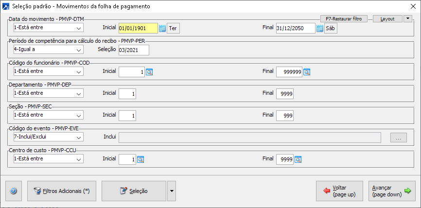 utilizado para excluir os eventos selecionados dos movimentos, respeitando a seleção. É obrigatória a seleção de pelo menos um evento no botão Seleção eventos.