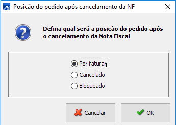 Ao informar a nota para cancelamento, se a mesma estiver vinculada a algum pedido, será necessário definir que ação tomar com relação ao status do pedido vinculado: