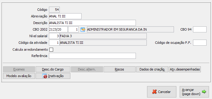 No campo código, pressionar F4 + ENTER para obter o próximo número vago, preencher a abreviação e nome do cargo. No campo CBO 2002 pressionar F8 e consultar os CBOs disponíveis. O campo descrição de cargos deve ser preenchido com informações relativas às atividades e rotinas inerentes à cada cargo, como atribuições, deveres, responsabilidades e também as formações acadêmicas, cursos e requisitos necessários para ocupação do cargo e servirá de base para o desenvolvimento das demais rotinas do RHU.